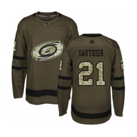>Men's Adidas Carolina Hurricanes #21 Julien Gauthier Authentic Green Salute to Service NHL Jersey