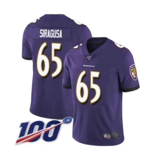 >Men's Baltimore Ravens #65 Nico Siragusa Purple Team Color Vapor Untouchable Limited Player 100th Season Football Jersey