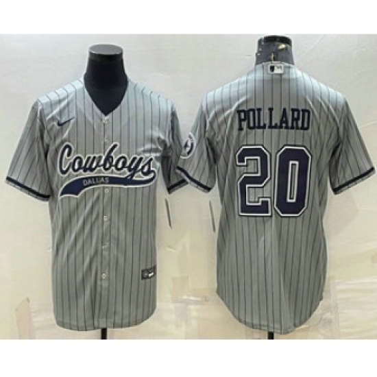 >Men's Dallas Cowboys #20 Tony Pollard Grey Pinstripe With Patch Cool Base Stitched Baseball Jersey