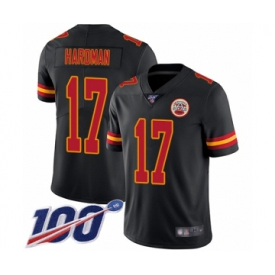 >Men's Kansas City Chiefs #17 Mecole Hardman Limited Black Rush Vapor Untouchable 100th Season Football Jersey