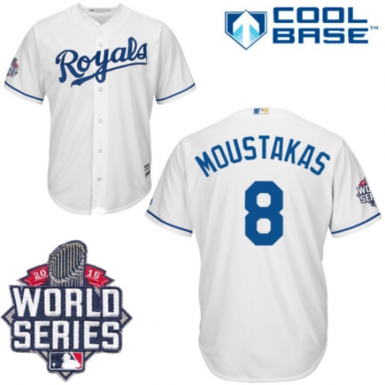 Home>MLB>Kansas City Royals>Mike Moustakas>Men's Majestic Kansas City Royals #8 Mike Moustakas Replica White Home Cool Base 2015 World Series