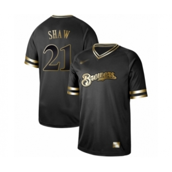 >Men's Milwaukee Brewers #21 Travis Shaw Authentic Black Gold Fashion Baseball Jersey