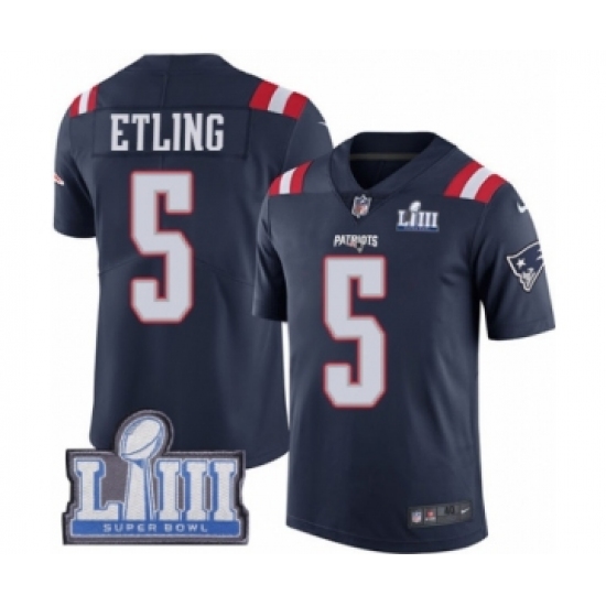 >Men's Nike New England Patriots #5 Danny Etling Limited Navy Blue Rush Vapor Untouchable Super Bowl LIII Bound NFL Jersey