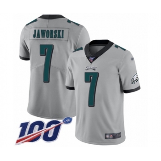 >Men's Philadelphia Eagles #7 Ron Jaworski Limited Silver Inverted Legend 100th Season Football Jersey