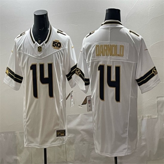 Men's Seattle Seahawks #14 Sam Darnold White Gold 2025 F.U.S.E. 50th Season Vapor Limited Stitched Football Jersey