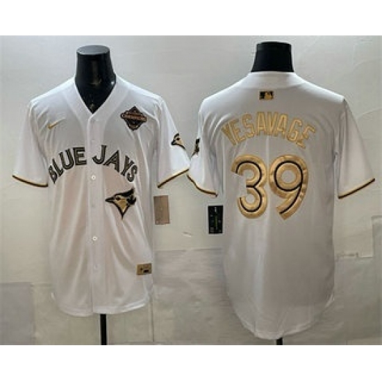 >Men's Toronto Blue Jays #39 Trey Yesavage White Gold 2025 American League Champions Limited Stitched Jersey