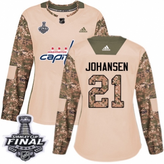Women's Adidas Washington Capitals #21 Lucas Johansen Authentic Camo Veterans Day Practice 2018 Stanley Cup Final NHL Jersey