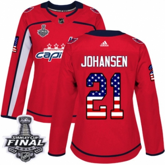 >Women's Adidas Washington Capitals #21 Lucas Johansen Authentic Red USA Flag Fashion 2018 Stanley Cup Final NHL Jersey