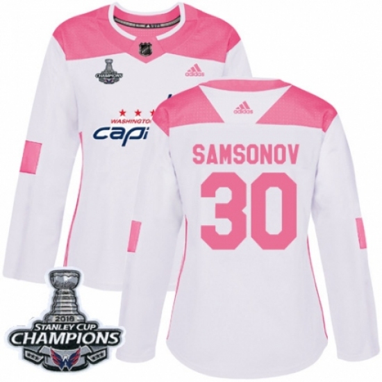 Women's Adidas Washington Capitals #30 Ilya Samsonov Authentic White Pink Fashion 2018 Stanley Cup Final Champions NHL Jersey
