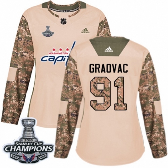 >Women's Adidas Washington Capitals #91 Tyler Graovac Authentic Camo Veterans Day Practice 2018 Stanley Cup Final Champions NHL Jersey