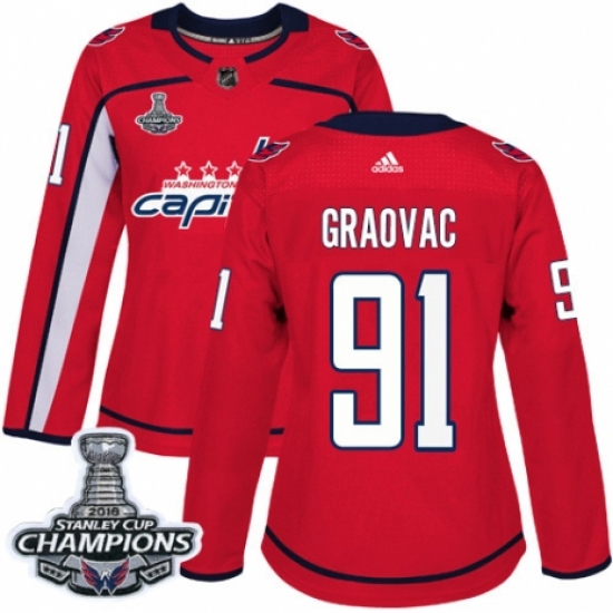Women's Adidas Washington Capitals #91 Tyler Graovac Authentic Red Home 2018 Stanley Cup Final Champions NHL Jersey