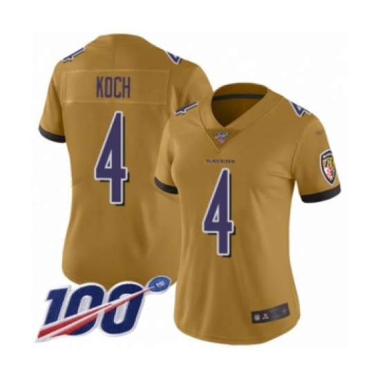 >Women's Baltimore Ravens #4 Sam Koch Limited Gold Inverted Legend 100th Season Football Jersey