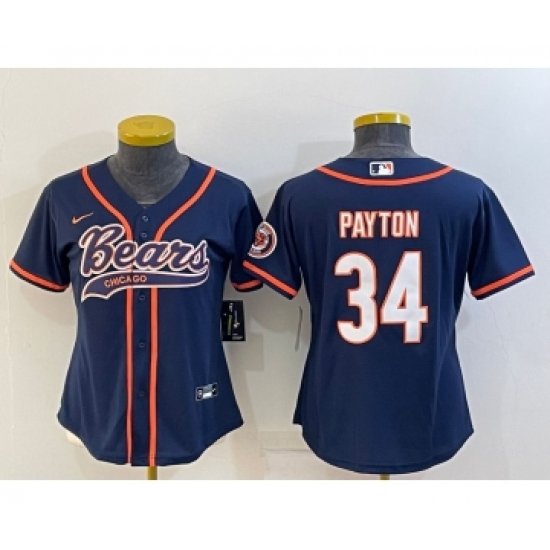 >Women's Chicago Bears #34 Walter Payton Navy With Patch Cool Base Stitched Baseball Jersey