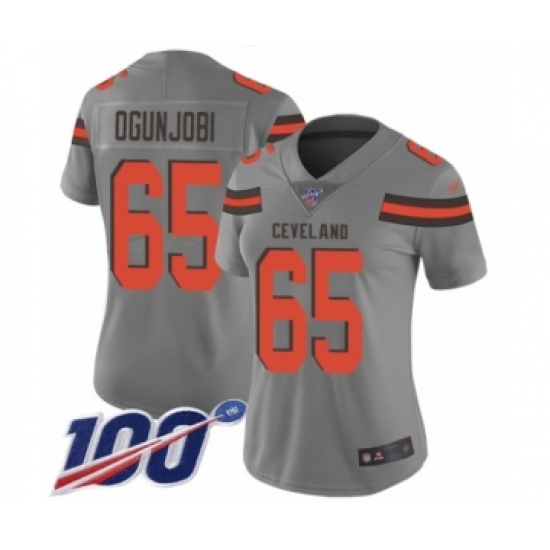 >Women's Cleveland Browns #65 Larry Ogunjobi Limited Gray Inverted Legend 100th Season Football Jersey