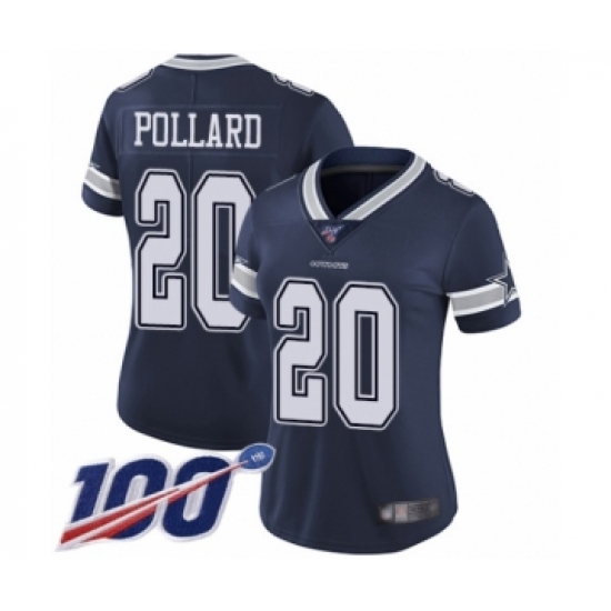 >Women's Dallas Cowboys #20 Tony Pollard Navy Blue Team Color Vapor Untouchable Limited Player 100th Season Football Jersey