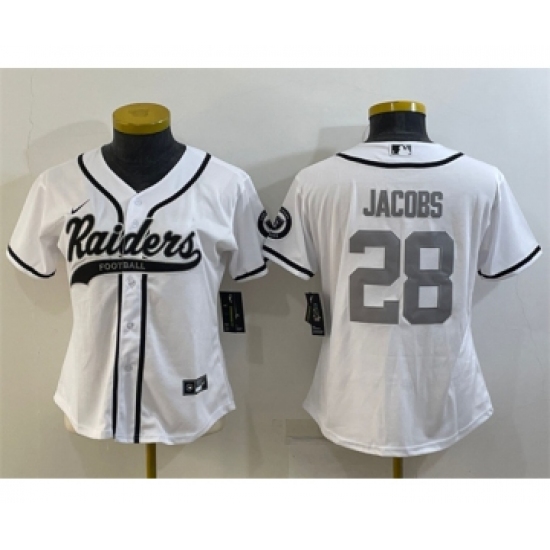 Women's Las Vegas Raiders #28 Josh Jacobs White Silver With Patch Cool Base Stitched Baseball Jersey(Run Small)
