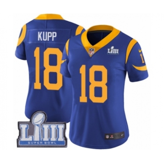 >Women's Nike Los Angeles Rams #18 Cooper Kupp Royal Blue Alternate Vapor Untouchable Limited Player Super Bowl LIII Bound NFL Jersey