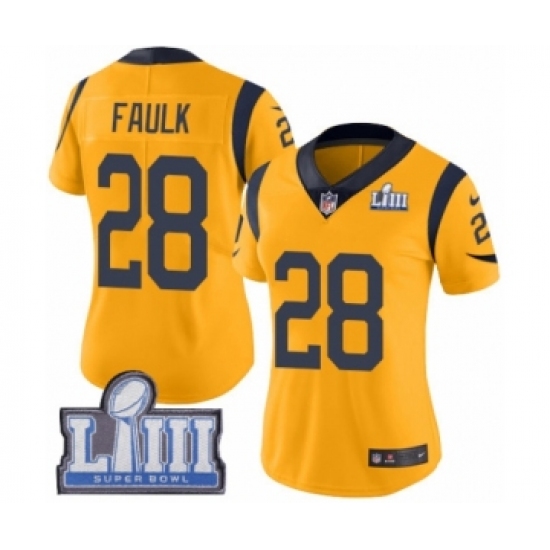 >Women's Nike Los Angeles Rams #28 Marshall Faulk Limited Gold Rush Vapor Untouchable Super Bowl LIII Bound NFL Jersey