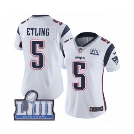 >Women's Nike New England Patriots #5 Danny Etling White Vapor Untouchable Limited Player Super Bowl LIII Bound NFL Jersey