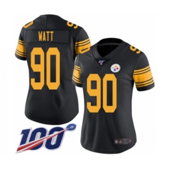 >Women's Pittsburgh Steelers #90 T. J. Watt Limited Black Rush Vapor Untouchable 100th Season Football Jersey