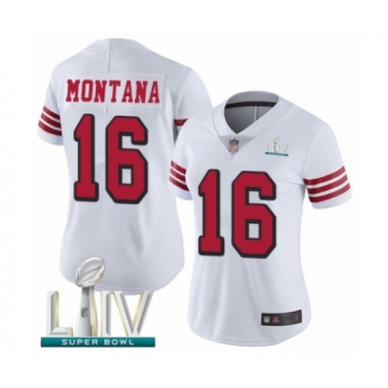 >Women's San Francisco 49ers #16 Joe Montana Limited White Rush Vapor Untouchable Super Bowl LIV Bound Football Jersey