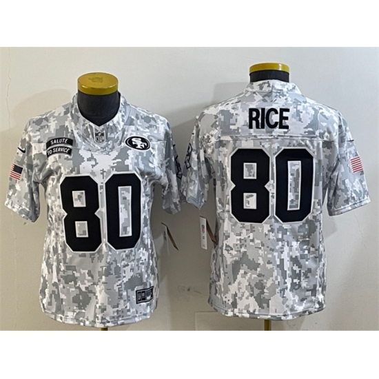 >Women's San Francisco 49ers #80 Jerry Rice 2024 F.U.S.E. Arctic Camo Salute to Service Limited Football Stitched Jersey(Run Small)