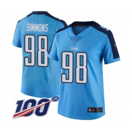 >Women's Tennessee Titans #98 Jeffery Simmons Limited Light Blue Rush Vapor Untouchable 100th Season Football Jersey