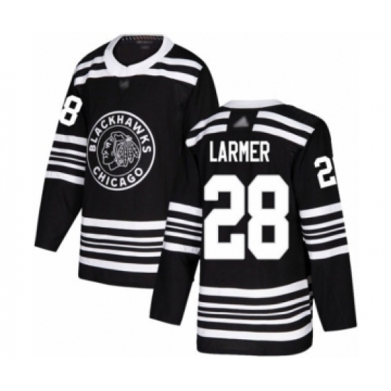 Men's Adidas Chicago Blackhawks #28 Steve Larmer Authentic Black 1917-2017 100th Anniversary NHL Jersey