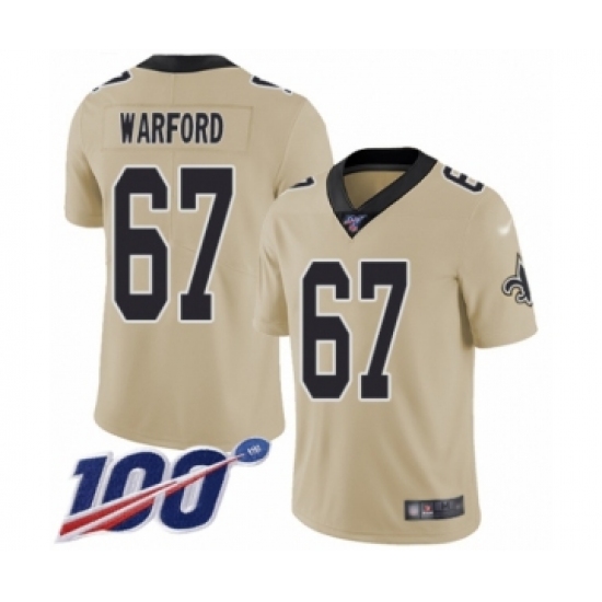 >Youth New Orleans Saints #67 Larry Warford Limited Gold Inverted Legend 100th Season Football Jersey